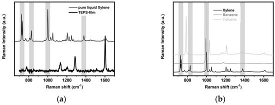 In Figure 13a, the Raman spectra of the TEPS film and pure xylene, collected using 25 mW input power (3 spectra × 10s/spectrum), are compared.