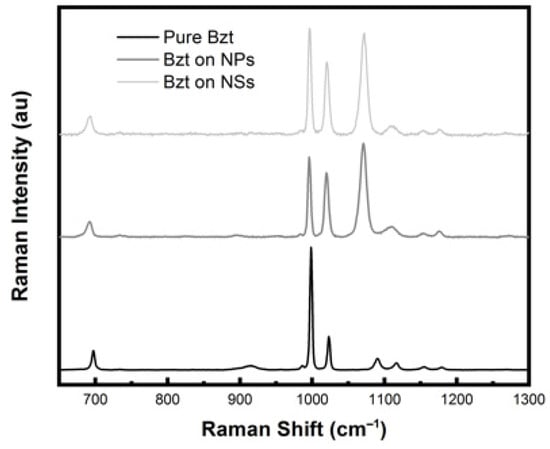 In this experiment, the closed setup was used as a liquid cell: the AuNSs substrate was placed in the closed device, and the cell was filled with the organic solution and directly positioned under the SERS microscope. The collected spectra, recorded at an input laser power of 0.24 mW (20 spectra × 10 s/spectrum), are reported in Figure 18a.