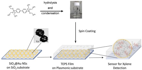 In order to improve the selectivity and/or sensibility in SERS detection experiment, the affinity of the analytes to the substrate is often improved in several ways: for example, by functionalizing their surface with suitable receptors, by using aptamers or molecular imprint polymers [32], diazonium salt [33], polydimethylsiloxane (PDMS) [27], hydrophobic sponges [28], and metal-organic frameworks (MOFs) [34]. In addition, hybrid organic-inorganic sol-gel films have been proposed for separation and sensing applications [35,36]. In particular, bridged polysilsesquioxanes are an interesting class of versatile functional materials: by changing the bridged compound, one can exploit many different functional groups, ranging from disulfides to aromatics and ureic groups, showing affinity to different analytes. These polysilsesquioxanes have been exploited as VOC adsorbents [28,37]. The use of polysilsesquioxanes for the detection of VOC has also been tested, through LSPR in coated substrates [38]. Moreover, the use of hybrid sol-gel materials allows for fine-tuning of the porosity of the final films [39].