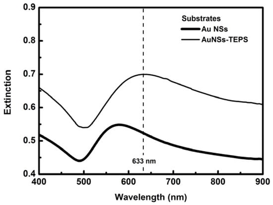 Extinction spectra of Au NSs substrate (thick black line) and AuNSs-TEPS film (thin black line) deposited on glass.