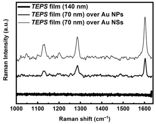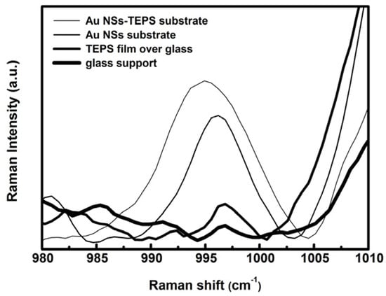 The TEPS substrates were tested using the micro-Raman setup and exciting the sample with 0.03 mW laser power; the collected Raman spectra are reported in Figure 17.
