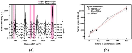 SERS measurements at different concentrations of xylene in cyclohexane solution, ranging from 0 to 800 mM, are shown in Figure 18a. The signals evidenced in red are the Raman bands of the sol-gel matrix, the gray ones (at 722–730 and 997 cm−1) are the more intense xylene bands, not superimposed with the matrix or cyclohexane, and the others (at 798, 1024, 1155, 1264, and 1442 cm−1) can be attributed to cyclohexane. The xylene bands at 722–730 and 997 cm−1 clearly emerge when increasing amounts of the analyte are added (spectra of 40 to 800 mM) and were used to evaluate the sensitivity of the realized system to the xylene concentration. To this end, the intensity of the xylene SERS bands is reported as a function of the xylene concentration, in Figure 18b, where the linear fit of the 722–730 cm−1 modes is also reported and shows a good linear dependence of the signal with the xylene concentration (Adj R-square of 0.96). This value is comparable to a SERS based Napthalene sensor [56] and is within the range of literature of other SERS sensors for polycyclic aromatic hydrocarbons [57], for food products [58] and for food contaminants [59].