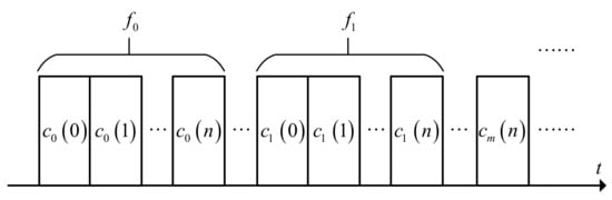In Figure 1, represents the frequency hopping code of the m-th sub-pulse. If the length of the phase-coding sequence of the sub-pulse is , then the phase-coding sequence for the m-th sub-pulse is , where represents the number of discrete phases.
