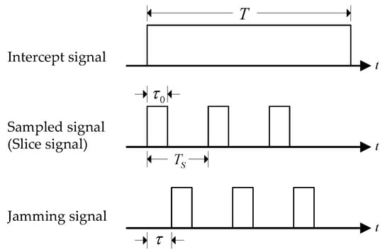 The signal structure of the intra-pulse slice repeater jamming generated by the enemy jammer is shown in Figure 2. The jammer intercepts part of the radar signal in the time domain according to the sampling period to generate the intercepted signal, which can be regarded as multiplying the radar signal with an ideal rectangular pulse with a sampling period of and a width of to obtain an intra-pulse slice signal. The slice signal is processed by power amplification and delayed-forwarding to generate an intra-pulse slice repeater jamming signal. After the radar receives the intra-pulse slice repeater jamming, multiple deception targets are formed due to the coherence of the repeater jamming.