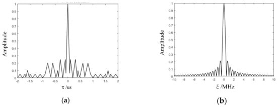 Let and , the zero-delay cut and the zero-Doppler cut of the 2D ambiguity function shown in Figure 5 could be obtained, which are depicted in Figure 5a,b, respectively. The velocity ambiguity function, main peak amplitude, and Doppler tolerance of FSK-PSK signals are all equivalent to PSK signals.