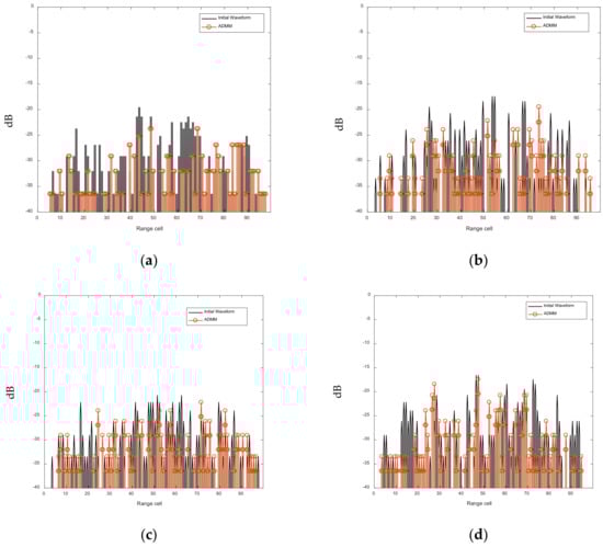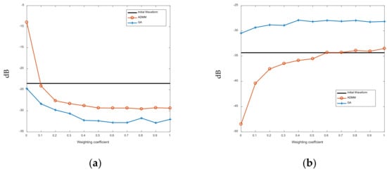 It can be seen from Figure 9a that as the weighting coefficient increases, the AC-ASL of the FSK-PSK signals optimized with the ASRJ-ADMM algorithm and the GA algorithm decreases gradually, while the AC-ASL of the FSK-PSK signal untouched by the waveform optimization algorithms remains constant. It could also be seen that the AC-ASL offered by the GA algorithm is slightly lower than that of the ASRJ-ADMM algorithm by 2–3 dB. However, this marginal performance gain of the GA algorithm over the ASRJ-ADMM algorithm is at the cost of higher CC-AL. As shown in Figure 9b, although the CC-AL of the proposed ASRJ-ADMM algorithm increases with the weighting coefficient, its maximum value is approximately equal to that of the FSK-PSK signal untouched by either optimization algorithms, and is 5–6 dB lower than that of the FSK-PSK signal optimized with the GA algorithm.