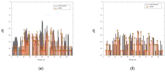 Figure 10 and Figure 11 show that, after the ADMM-based optimization process, the AF sidelobes and cross-correlations of the FSK-PSK signal are suppressed. Table 5 compares the AC-ASL and CC-AL before and after the ASRJ-ADMM optimization. It can be seen from Table 5 that both the AC-ASL and CC-AL are suppressed with the ASRJ-ADMM algorithm. However, based on the preliminary simulation results that are not presented in this work, as the number of discrete phases K further increases, the optimization effect may not improve accordingly.