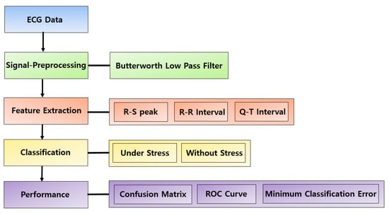 Figure 1 shows the classification procedure of the ECG data using a stress classification model that combines SVM and NB. In this study, the CLAS database was used to analyze HRV according to the emotional state of the test subject [17]. A Butterworth low-pass filter was used to remove noise from the ECG signal. After detecting the Q, R, S, and T peaks of the ECG signal using the threshold values, the average values of the R-S peak, R-R interval, and Q-T intervals were calculated. Then, the average values of these quantities were applied to the SVM-NB algorithm to classify the stress signal. Finally, the stress classification performance used the confusion matrix, ROC curve, and minimum classification error. The dataset consisted of 31 ECG data in four categories (Picture Test, Music Video, Stroop Test, and Math Test). Stress levels 1 and 2 indicate calmness and excitement, respectively, and the signals measured in the picture test and music video environments in the four emotional states are included. Stress levels 3 and 4 are boredom and stressed, and include the Stroop Test and Math Test in four emotional states. Therefore, stress levels 1 and 2 correspond to conditions without stress, whereas stress levels 3 and 4 indicate stress.