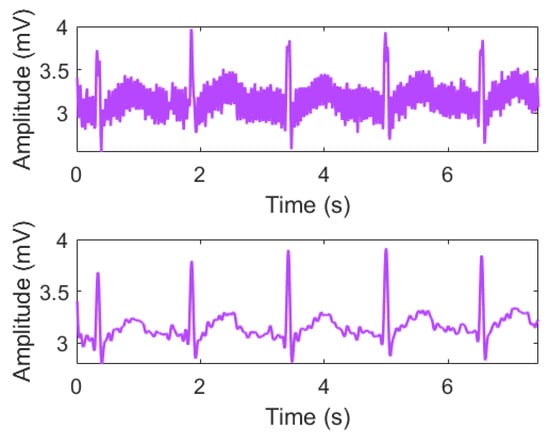 The ECG signal is widely used owing to its simple measurement technique. When measuring an ECG, noise is generated by various factors. Noise originating from various causes hinders the extraction of feature points for analyzing signals and greatly reduces accuracy [18]. A low-pass filter, such as the Butterworth low-pass filter or Chebyshev low-pass filter, is used to solve this problem.