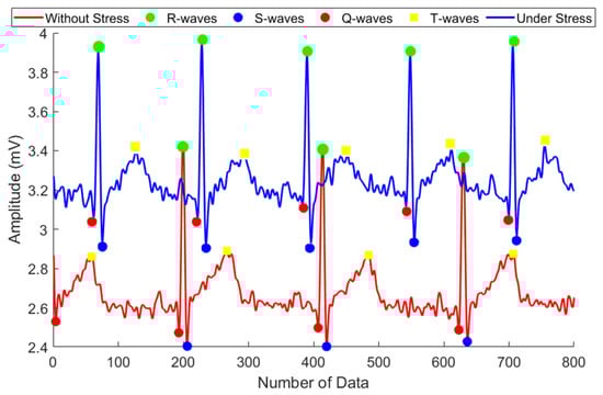 Under stress, the heart rate increases and the R-S and Q-T peaks increase. Conversely, without stress, the heart rate stabilizes and the R-S and Q-T peaks become smaller [20].