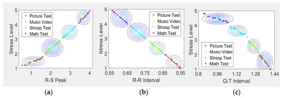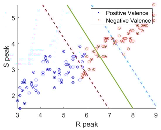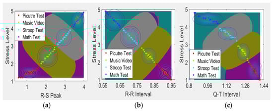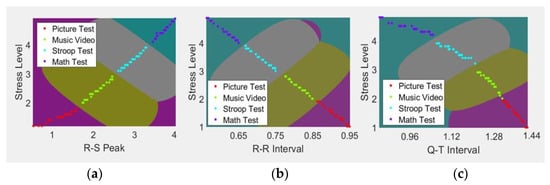 The data for the R-S peak, R-R interval, and Q-T interval were classified according to stress levels after determining the margin for the decision boundary between the classes of the four emotional states using Equations (6) and (7), where c represents the number of classes, X represents a decision boundary, W represents a vector perpendicular to the decision boundary, B represents a bias, and Min represents the margin: