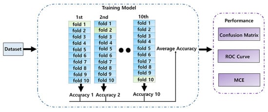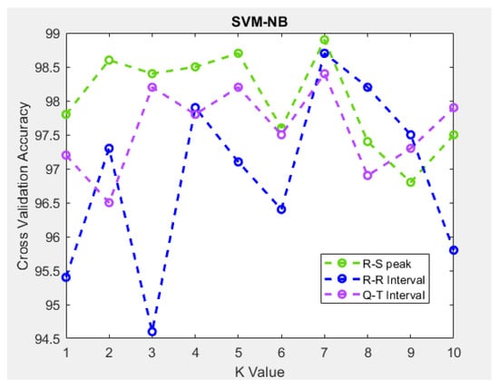 As shown in Figure 9, the performance of the stress classification model combining SVM and NB was demonstrated using 10-fold cross-validation. Owing to the classification, overfitting can be prevented by achieving accuracies of 98.9%, 98.7%, and 98.4% using 7-fold cross-validation.