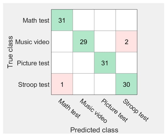 Figure 10 shows the performance of a stress classification model that combines SVM and NB using a confusion matrix [33]. The green squares indicate true positives. The blue rectangle results from the correct classification of data by the designed classifier. The red squares indicate false positives. The purple rectangle results when the designed classifier incorrectly classifies music video-related data as Stroop Test data. Therefore, it indicates that the data related to the Math Test and the Picture Test were classified more correctly than the data related to the Stroop Test and Music video.