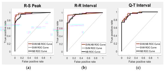 Stress classification combining SVM and NB. (a) R-S peak results combining SVM and NB, (b) R-R interval result combining SVM and NB, and (c) Q-T interval result combining SVM and NB.