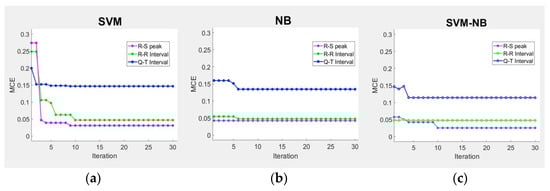 Evaluation of stress classification performance using MCE. (a) Evaluation of stress classification performance of SVM using MCE. (b) Evaluation of stress classification performance of NBs using MCE. (c) Evaluation of stress classification performance combining SVM and NB using MCE.