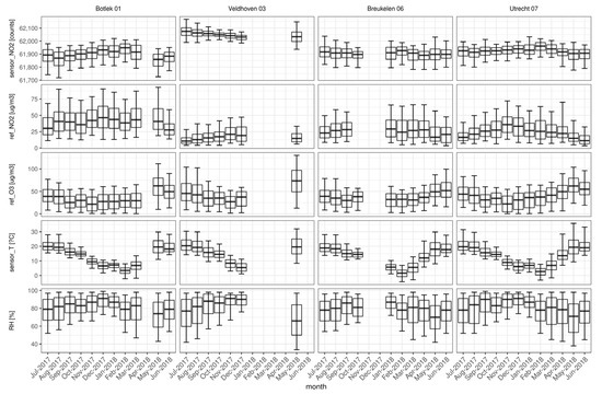 To show the variability over location and time of the predictors used in the calibrations, box plots are presented on a monthly basis (Figure 2). The lines extending vertically from the boxes indicate the variability outside the upper and lower quartiles (denoted by 5th and 95th percentiles). The variables included are the raw sensor NO2 data (counts), reference measurement of NO2 (refNO2 in µg/m3) and O3 (refO3 in µg/m3), temperature (sensorT in °C) and relative humidity (RH in %) measured at the nearest weather station. Only months with at least 200 h (8 days) of measurement data are included (leading to the loss of monthly statistics at Veldhoven and Breukelen).