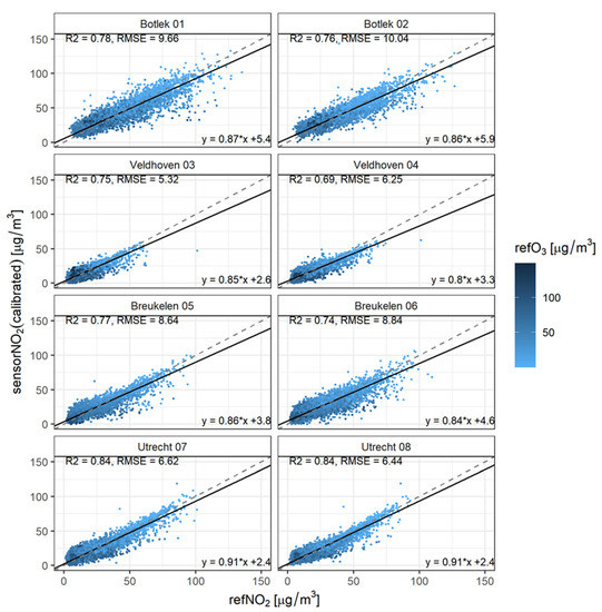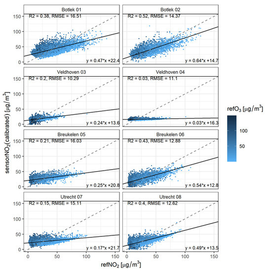 Single linear regression is used to calibrate the sensor data using all available sensor and reference measurements. Subsequently, a univariate orthogonal regression has been used to determine the slope and intercept of the calibrated sensors with respect to the reference measurements. In this case, the validation dataset equals the calibration data. Validation metrics are given per sensor in Figure 3 (and summarized in Table 2). The color of the data points indicates whether ozone concentrations are high or low (darker means higher). The dashed line represents Y = X and the solid line follows from the orthogonal fitting between the calibrated sensor and reference concentration data.
