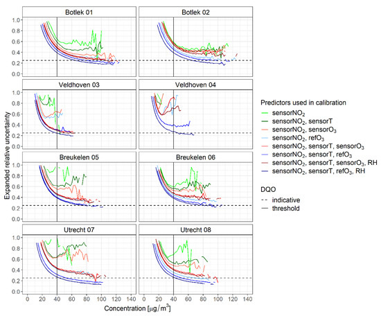 In our study, the behavior of individual sensors is discussed by designing several (multi-)linear regression models. These were constructed for the Alphasense NO2-B43F sensor [17] to predict continuous reference data and are based on the predictor variables: NO2 measured by the sensor, temperature, relative humidity and ozone (either by reference instrumentation or by a sensor) in ambient air. Our analyses also include interaction (or cross) terms (the product of two or more independent predictor variables). Such terms describe the effect that the relationship between a given (independent) predictor and the outcome may also depend on other predictor variables. The performance of such models is expressed here in several validation metrics including the expanded relative measurement uncertainty which, following [18,19], was compared with the Data Quality Objectives (DQO) as defined in the Air Quality Directive.