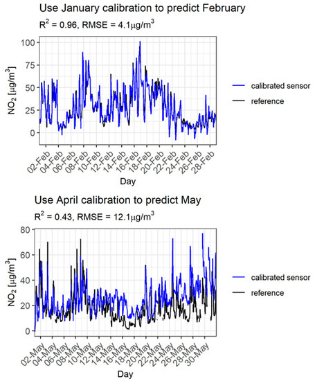 The top part of Figure 7 shows that a model ‘trained’ with data from January can make good predictions for February. Trained with data from April, the model overpredicts the measured concentrations in May from the second half of the month (bottom part of Figure 7). This could be explained by different reference concentrations and meteorological circumstances from those encountered in the calibration month.