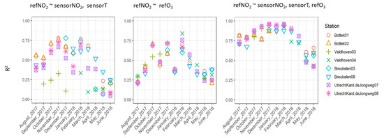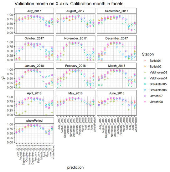 The combined results of this approach for all stations and available months are presented in Figure 8 where performances are expressed in terms of explained variance (R2). The title in each subgraph corresponds to the month providing the calibration data. The X-axis corresponds to the (monthly) period for which the validation is done, i.e., the top-left graph shows the R2 between the NO2 of the sensors and that of the co-located reference measurements for the months July 2017–June 2018, when the sensors were calibrated using the data from July 2017. The vertical gray line indicates when the calibration and validation month coincide. Results to the right of this line are based on a calibration that was determined before the validation was performed. Results to the left of the line indicate how the calibrated sensor predicts the concentrations per month when it is calibrated using the dataset from a future month. The last tick mark on the X-axis gives the R2 when the entire year is used as validation data (discussed in previous paragraphs).