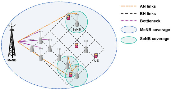 To overcome the short communication range of the mmWave link due to its high pathloss and low penetration, beam forming based on directional antennae and repeaters for amplifying is necessarily considered. Figure 1 shows the HetNet equipped by a multi-hop backhaul mesh network for long-range backhauling of the mmWave links, in which an SeNB unreachable by the MeNB can access the Internet through multi-hop relays of the SeNBs [4,5]. The mmWave-based backhaul mesh networks have several challenges, such as efficient radio resource management (RRM) [5,6], interference management [7,8], multi-hop routing [9], and energy saving [10].