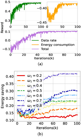 Figure 5b,c show that the energy saving (i.e., 1-consumed energy/maximum energy) and mean data rate converge at different iterations according to the reward weight; the reward convergence is achieved at an average of 80 K training iterations, about 21.5 min on our server for each weight value. To find the optimal solutions, iterative learning for all possible weight vectors is needed. Therefore, the computation delay depends on the granularity of the weight values to explore; this experiment demands a total of 80 K · 7 iterations.