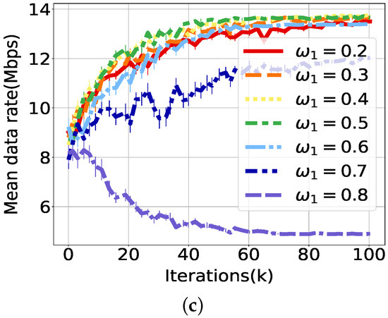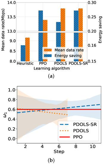 Figure 5. Performance evaluation of PPO according to reward weight ( ω 2 = 1 ω 1 ). (a) Scalarized reward. (b) Energy savings. (c) Average data rate per UE.