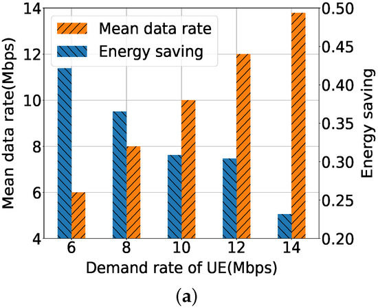 Next, we evaluate the PDOLS algorithm to find the optimal value and weight in a HetNet environment with a varying demand rate and number of UEs. In Figure 6a, the mean data rate satisfies most of all demand rates except for 14 Mbps: 6, 8, 10, 12, and 13.39 Mbps. The energy savings of the HetNet is inversely proportional to the demand rate: 0.42, 0.37, 0.31, 0.30, and 0.23. For these values, the ω 1 of the optimal weight is 0.79, 0.72, 0.65, 0.64 and 0.57, with respect to each data rate.