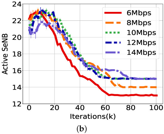 Figure 6b shows the change of the active SeNBs during the learning procedure. Most of the 25 SeNBs are turned on at the beginning of learning, but after 80K iterations, almost 10–12 SeNBs are switched off according to the UE’s demand rate. For the higher demand rate, more SeNBs are active to support the user traffic. Although the number of active SeNBs is the same for 10, 12, and 14 Mbps, energy consumption increases, especially for the 14 Mbps in Figure 6a, as power consumption of the active links increases proportionally by user traffic.