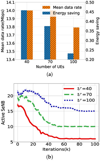We evaluate the performance of the PDOLS again with different numbers of UEs such as 40, 70 and 100, where the demand data rate is configured to be 14 Mbps. Figure 7a shows that both energy savings and the sum of the data rate increase as the number of UEs decreases. Accordingly, the user demand rate is mostly satisfied, except for 100 UEs. The energy saving is 0.46, 0.38, and 0.2, respectively, for each number of UEs. The corresponding active SeNBs are 6, 10, and 15, as shown in Figure 7b. Here, ω 1 of the optimal weight is found to be 0.8, 0.66, and 0.57 for each case. For 40 UEs, the number of active SeNBs is around 18 initially and decreases to up to 6 SeNBs, as data flows of many UEs use the same multi-hop paths provided by the active SeNBs. Otherwise, isolated UEs that have no path through the SeNBs directly access to the MeNB. Comparing the result of 100 UEs with 6 Mbps, we can conjecture that a higher number of UEs induces network-wide deployment, which consumes more RBs of the MeNB and transmission power for a smaller number of serving UEs.