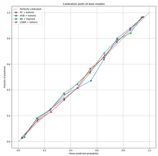 The RF, XGB, LGBM, and BB models that achieved comparative performance were calibrated based on isotonic and sigmoid methods. Figure 3 illustrates the initial models and their calibration with the aforementioned calibration methods. The results showed that for RF, XGB, and LGBM, the calibration with the Isotonic Regression method reached better results, while for the BB classifier, the Platt Scaling (Sigmoid) method presented better performance. From the comparative evaluation, depicted in Figure 4, the LGBM classifier calibrated with the Isotonic Regression method presented the best overall performance, as it is asymptotically closer to the dotted line that represents the perfectly calibrated model (Figure 4 and Figure 5).