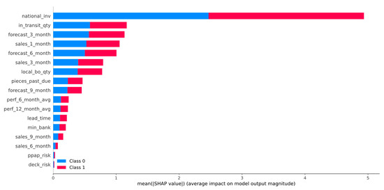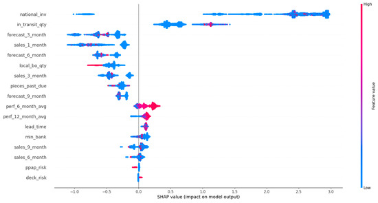 Figure 6 presents the features’ impact on the output of the best model (LightGBM + Isotonic) for the proposed dataset. The features were sorted by the mean absolute value of the SHAP values which represent the SHAP global feature importance. Furthermore, the most important features that significantly affected the prediction output of the model were the national_inv, the in_transit_qty, the forecast_3_month, the sales_1_month, and the forecast_6_month. The national inv concerns the current inventory level of components. The feature in transit qty describes the quantity in transit, and the sales_1_month concerns the sales quantity in the prior month. The features forecast_3_month and forecast_6_month relate to the forecast sales for the next 3 and 6 months.