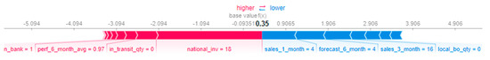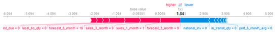 Figure 8 shows that the topmost influential features n_bank, perf_6_month_avg, in transit, national_inv, sales_1_month, forecast_6_month, sales_3_month, and loval_bo_qty led to the prediction value of 0.35, which was transformed to 1. The features that are indicated with red color influenced positively, which means that they dragged the value closer to 1, while the features in blue color had the opposite effect. Similarly, for an example of a backordered product, Figure 9 shows the values of the top influential features that pushed the product to the backordered class. It is observed that lower values of inventory stock, products’ quantity received, and source performance of the last 6 months and higher values of forecasts and sales pushed the output prediction to the non-backordered class.