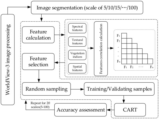 The uncertainty of OBIA has also caused many problems, including segmentation scale selection, sample training, and accuracy assessment. The segmentation scale affects the accuracy of the image information extraction. A large segmentation scale cannot precisely extract relatively small objects, which means these small objects are submerged by the large objects. When the segmentation scale is small, the large object targets may be over-segmented, which can cause tattered results, and thus, the objects’ features cannot be exactly reflected. The image segmentation scale is one of the most important factors in image analysis and calculation [26,27,28,29,30,31]. Without good segmentation results, excellent information extraction and target recognition cannot be achieved. Therefore, in this study, the land objects’ extraction results based on different segmentation scales were compared, and the scale effect caused by multiresolution segmentation was also analyzed. Therefore, this study aims to explore segmentation scale effect on high-spatial resolution images based on OBIA. First, 20 different segmentation scales were applied in the image segmentation. The CART, which is widely used as the basis for machine learning algorithms, including bagging decision and boosting decision trees [32], has been applied for the image classification in this study. In order to classify the WorldView-3 (WV-3) image using the OBIA method, a framework based on feature selection and multiple segmentation scale comparison was established. Field sampling data and forestry inventory data were used as training and validation samples; the manual interpretation is also applied to the WV-3 image to build the classification framework and prior knowledge. Then, the CART classifier was used to classify the image of the study area, and a confusion matrix was used for the accuracy assessment. Furthermore, an equation that reflects the relationship between the optimal segmentation scale and the land object’s average areas was established, which helped determine the optimal segmentation scale from the perspective of the area-based method. The study result was designed to be incorporated into a workable and trusted technique solution for image classification; it provides an effective method for high-spatial-resolution image classification based on OBIA.