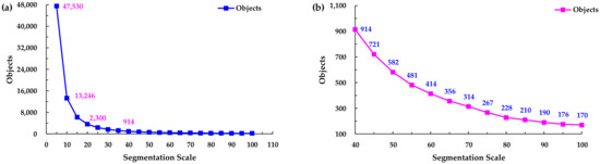 Figure 3. Scale versus number of objects. (a) General view of segmentation scale 5–100; (b) Local enlarged view of segmentation scale 40–100.