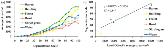 Figure 5. Relationship between the optimal segmentation scale (a) and the land objects’ average areas (b).