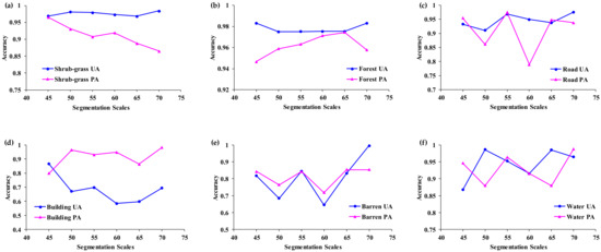 Comparisons of the shrub-grass and forest’s user’s accuracies and producer’s accuracies are shown in Figure 7. According to the statistical results, the user’s accuracies of the shrub-grass, forest, building, and barren land increase as the segmentation scale increases, but the user’s accuracy of water decreases as the segmentation scale increases. For segmentation scale 70, the user’s accuracies of the shrub-grass, forest, roads, and barren land are the highest at 98.4%, 98.31%, 97.6%, and 99.6%, respectively. The producer’s accuracy of the shrub-grass decreases as the segmentation scale increases. The producer’s accuracy of the forest increases in the scale range of 45–65, but decreases at scale 70. Overall, both the user’s accuracy and producer’s accuracy change with the segmentation scale.