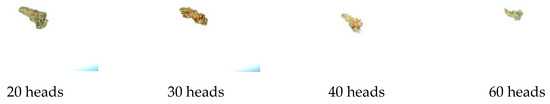This study takes Panax notoginseng planted in Wenshan City, Yunnan Province, as the research object. According to the market research, it is known that more than 90% of Panax notoginseng sold in the market have between 20 and 60 heads. Therefore, after preliminary treatment, 450 three-year-old “spring” Panax notoginseng samples with 20 heads (grade I), 30 heads (grade II), 40 heads (grade III), and 60 heads (grade IV) were selected, and the moisture content of these samples was less than 13%. The samples of different grades were weighted one by one before image information collection. The four different grades of Panax notoginseng main roots are shown in Figure 1.