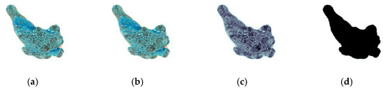 To facilitate feature extraction and improve the algorithm efficiency, in this study, the resolution of the original image (Figure 3a) was adjusted from 1280 × 1024 to 512 × 512. Then, the image was denoised with a Gaussian filter (Figure 3b), and the filtered image was converted to grayscale (Figure 3c). Next, an open (corrode) operation with a 5 × 5 kernel function and a closed (dilate) operation were used to remove image noise, and the holes in the target were filled. Finally, the grayscale image was binarized using the Great Law (Otsu) threshold value (Figure 3d).
