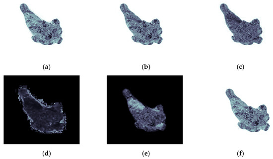 In this study, the color moment method was adopted to extract the color features of the Panax notoginseng samples through two color-space models, RGB and HSV [25,26,27]. Because the color information is mainly distributed in low-order moments, the color distribution of Panax notoginseng taproot images was expressed by first-order moments (mean), second-order moments (variance), third-order moments (skewness), and fourth-order moments (kurtosis). Therefore, a total of 24 color features of R (Figure 5a), G (Figure 5b), B (Figure 5c) and H (Figure 5d), S (Figure 5e), and V (Figure 5f) were obtained. A visualization of a Panax notoginseng sample is shown in Figure 5.