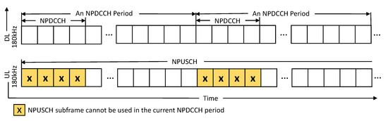 To use the radio resources in NB-IoT networks, before each user equipment (UE) can send data, each UE must periodically monitor a search space in the narrowband physical downlink control channel (NPDCCH) to decode a downlink control indicator (DCI). A DCI is used to carry the uplink parameters for a UE so that the UE can know how to use the narrowband uplink shared channel (NPUSCH) subframes for transmitting data. This period is called the NPDCCH period (NP) in NB-IoT and can be flexibly adjusted for UEs with different channel qualities. However, because low-cost NB-IoT UEs operate in the half-duplex mode, the UEs cannot simultaneously monitor search spaces in NPDCCHs of a downlink frequency (DL) and transmit data in the NPUSCH of an uplink frequency (UL). As a result, when the UEs periodically monitor the search space in the NPDCCH, we observe that a percentage of uplink subframes will be wasted, as shown in Figure 1. Furthermore, the wasted percentage is higher when the NPDCCH period length is shorter. To overcome this issue, we propose the concept of cross-cycled resource allocation to efficiently use the traditionally unusable NPUSCH subframes to increase resource utilization. Specifically, we allow UEs to stop monitoring their search spaces in the next NP while continuously transmitting data in the NPUSCH subframes from the current NP to the next NP without causing any interference. We explain the cross-cycled resource allocation in detail in Section 2.