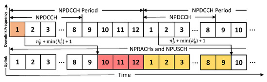 Huang et al. [8] investigated the influence of scheduling parameters on the resource allocation problem and designed an algorithm to schedule a large number of UEs. Pei et al. [9] proposed an algorithm to control the number of UE connections to increase the probability of successful connections by ensuring that the UEs complete the random access and data transmission processes. Kodheli et al. [10] considered the use of low-Earth orbit satellites to provide the NB-IoT connectivity to on-ground UEs. Liang et al. [11] investigated the link adaptation problem and designed a heuristic algorithm to minimize the energy consumption. Finally, Yu et al. [12] designed a resource allocation algorithm that considers narrowband physical random access channels (NPRACHs) to minimize the consumed subframes. However, these works do not consider the cross-cycled allocation for NB-IoT and waste many subframes, especially when an NPDCCH period length is short.