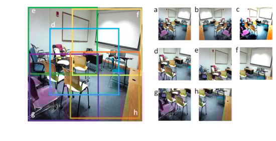 Each RGB and depth image is subjected to seven different augmentation methods such that the application of each method creates a new image and is independent of the other methods used. Hence, the enhanced training dataset is eight times larger than the original dataset. The set of eight images in the new training dataset corresponding to a single image in the unprocessed dataset are as follows: (a) original image, (b) horizontal flip, (c) contrast and brightness change, (d) zoom to the middle to obtain 60% of the image area, (e) crop 60% of the image from the top left, (f) crop 60% of the image from the top right, (g) crop 60% of the image from the bottom right, and (h) crop 60% of the image from the bottom left. A set of new images is shown along with the original image in Figure 2. The large image on the left is the original image. Boxes marked in the image show different crop areas used to create a new image set. Since contrast and brightness changes are not appropriate for depth images, new RGB images created with the contrast change operation are paired with original depth images.