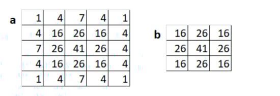 Preprocessing kernels: (a) 5 × 5 Gaussian smoothening kernel; (b) 3 × 3 Gaussian kernel.