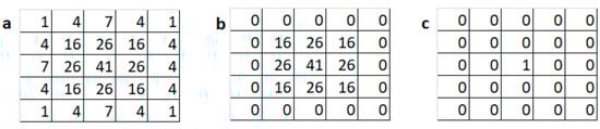 Weights of encoding layer filters: (a) 5 × 5 Gaussian smoothening filter; (b) 3 × 3 Gaussian filter with zero-padding; (c) Identity filter.