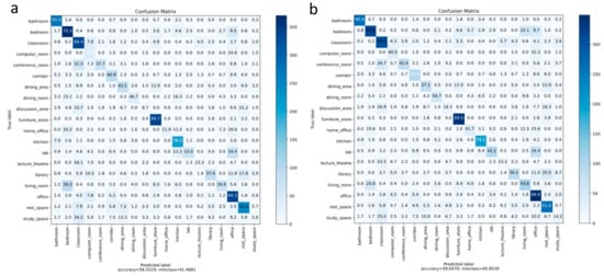 The confusion matrix for the RGBD CNN with CBE and data augmentation is shown in Figure 8a. It is noted that the network performed well for certain classes such as bathrooms, which had a classification accuracy of 94.9%, whereas it did not perform well for other classes such as discussion_area, which had a classification accuracy of just 8.7%. Approximately 33.7% of scenes belonging to discussion_area were wrongly classified as a classroom. One of the reasons for this result is that classrooms are similar to discussion areas in appearance. It can be observed that the classes with a smaller number of images in the training data performed poorly due to the class imbalance. The training became biased toward scenes with a larger number of images in the training dataset.