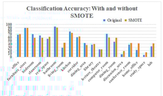 SMOTE oversampling was applied on features extracted at the output of the first dense layer of the trained RGBD CNN. The features extracted with 34,680 images from the augmented training data were stored in an array of size 34,680 × 4096. The minimum number of instances for a class in the augmented training set was 296, and the maximum was 4152. We experimented with various oversampling ratios and finally chose a ratio where the classes with 500 or fewer samples were upsampled to 1000 samples and classes with 1500 or fewer samples were upsampled to 1500 samples using the SMOTE approach. The resulting feature matrix was of size 41,080 × 4096. The confusion matrix of the test results with the network retrained with this new feature set is shown in Figure 8b. The overall accuracy increased marginally to 59.05%, as shown in Table 2. However, the classification accuracies of minority classes showed good improvement. For example, the classification accuracy of discussion_area improved from 8.7% to 18.3% with SMOTE. The number of scenes from discussion_area wrongly classified as classroom decreased from 33.7% to 26.9%. A comparison of classification accuracies with and without SMOTE for each scene category is shown as a bar chart in Figure 9. Classes in the bar chart are shown in the order of decreasing class size.