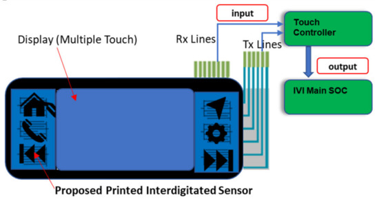 In order to create the final infotainment product, the flexible printed conductive layers are developed over the hard plastic layer. Considering that capacitance is directly proportional to electrode overlap area, spatial interpolation of electrodes structure in capacitive touch panels has a substantial impact on sensor performance [13,14], it is important to consider how the electrodes are organized. Due to its ability to change the capacitance, the distance between electrode structures can also have an impact on the sensitivity of an electrode structure. It is critical to pick the ideal overlap area and distance between electrodes in order to achieve improved sensitivity while also lowering production costs [15,16]. Digital mobility, increasing volumes of information [17,18], and drivers’ lives that are becoming increasingly linked and mobile, call for new methods of transmitting information, which are quickly reaching the limitations of display technology and operating system capabilities. A completely automated driving environment must also be used in conjunction with the new cockpit design in order for it to be successful. It is vital to have an understanding of future automotive advances.