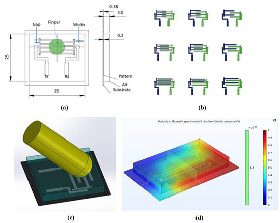 Design and simulation (a) Electrode Design (b) Sensor Pattern design (c) Parametric CAD Model (d) Capacitance/Electric Potential.