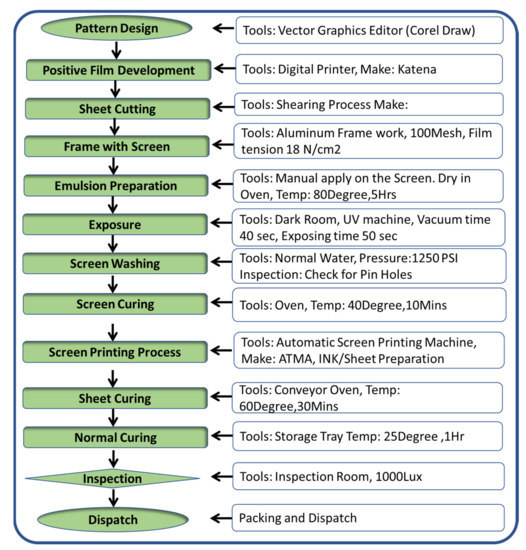 As part of this project, Ag nano particles conductive ink that consists of 70% Solids and 30% thermoplastics/additives (purchased from Siltech Corporation Inc, Bengaluru, India) was employed to create sensors electrodes for use in the fabrication of PICS [21,22,23]. A Polycarbonate sheets with a thickness of 375 microns was coated with a 15micronmeter layer of thickness over two separated conducting electrodes (X and Y). The sheet resistance was computed using 4 probes Hall Effect measuring system and it was found as 0.14 ohms. The fabrication process is explained in the process flow diagram as shown in Figure 5.